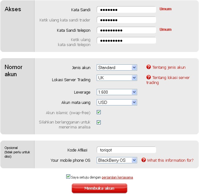 Setelah membaca Perjanjian penawaran umum Grup Perusahaan InstaForex Pembukaan Rekening Trading, maka langkah selanjutnya adalah anda klik kotak Accept terms of agreement , seperti contoh gambar di atas.